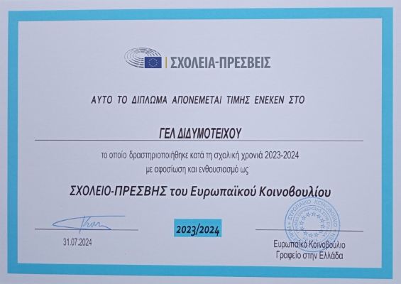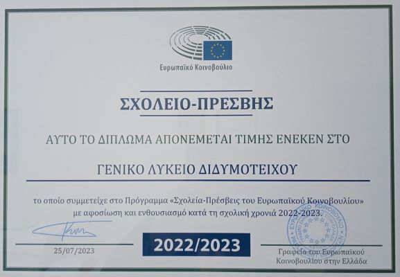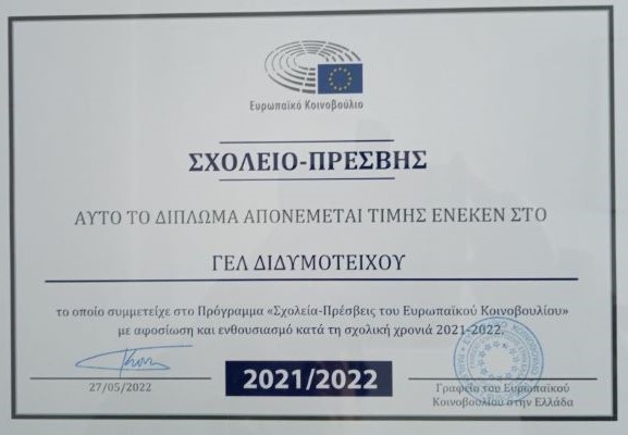 Το σχολείο μας συμμετείχε στο πρόγραμμα για τρεις συνεχόμενες σχολικές χρονιές με πρώτη το 2021-2022. Σε όλες τις χρονιές είχαμε επιτύχει τους στόχους του προγράμματος σε μεγάλο βαθμό για αυτό και αναγορευτήκαμε σε "Σχολείο Πρέσβης"!